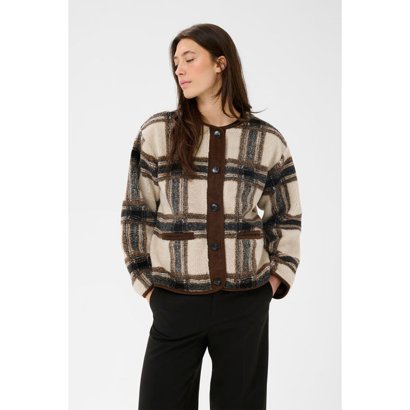 A long sleeve blouse in a check print with red accents.